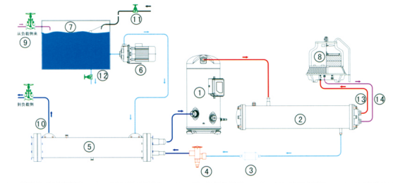 1、壓縮機(jī) 2、殼管式冷凝器 3、干燥過(guò)濾器 4、熱力膨脹閥 5、干式蒸發(fā)器 6、不銹鋼水泵 7、水箱